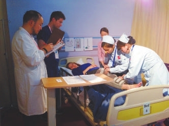 记者在现场看到,本次大赛引入“世界护理技能大赛”的标准,模拟了真实的医院环境,并通过巨型LED屏向观赛师生和专家进行赛程直播。现场所有的“标准病人”和“病人家属”都由特聘外教担任,参赛选手全程须用英语进行交流与诊断。这些挑剔的“病人”和“家属”会随机模拟骨折、哮喘等常见疾病,考验选手的人文关怀、临床思维、沟通交流、操作能力、团队合作能力和应变能力等临床综合护理能力。