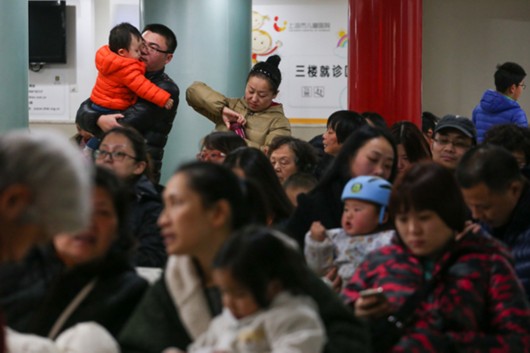 2015年12月16日,上海市儿童医院,家长带孩子排队看夜诊。 澎湃新闻记者 贾亚男 资料