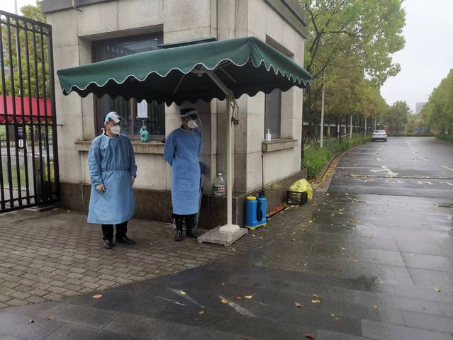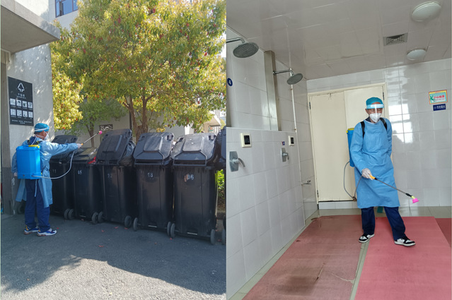 谢厚荣、陈贵琼夫妇来自贵州,两个月前参与到健康医学院南苑区的项目建设中,自疫情暴发以来,便承担起了部分校园绿化养护的工作,每天兢兢业业清扫落叶、管理绿化,为师生创造一个干净舒适的校园环境。李明存、雷军旗和苏少烈三位保安师傅连日来守卫在南苑校门口(天雄路311号),克服困难,服从安排,24小时盯紧盯牢进出校的所有人员和物品,成为学校真正的“守门人”。张军、张国民两位物业师傅,是南苑区物业消毒专班小组成员,他们承担了每天对于学生宿舍等室内楼宇的预防性消毒工作及校外缓冲区内大批量物资的消毒工作,不管炎热高温还是刮风下雨,一天数次对于负责区域进行全覆盖消毒,背着重重的药筒每次消毒完,已是浑身汗透。张岳松、张守奎、王华清等食堂师傅,每天面对成山的蔬菜果品,一箱一箱搬上搬下并进行消杀作业,将全校师生迫切需要的蔬菜水果安全供应到师生的餐盘里。刘坤玉阿姨为代表的食堂阿姨每天对运送进来的蔬菜水果认真清洗,一个简单的动作每天要重复2370多次。范黛红、顾志英、范建红为代表的宿管阿姨、保洁阿姨,每日参与到楼宇的日常管理、保洁消毒、核酸检测等工作中,关心每一名学生的喜怒哀乐,在学生眼里亲如一家。