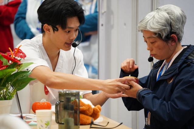 在不同场景、不同对象的照护中,闵思达身上表现的专业与温度更见细节:面对痴呆患者,他以低沉温暖的声线轻声安抚,帮助患者从紧张幻觉中回归现实世界,给出满满的安全感;照料截肢糖尿病患者时,他用坚定的鼓励话语,帮患者重塑生活希望;应对哮喘发作预防宣教时,他结合自身游戏经历,与16岁小患者完美共情,让宣教更具感染力;在面对突发扭伤情况时,他凭借果断而娴熟的专业照护操作,快速缓解患者不适。3天赛程、6个案例,他以“力量之刚”与“细腻之柔”,展现新时代男性护士的别样风采。