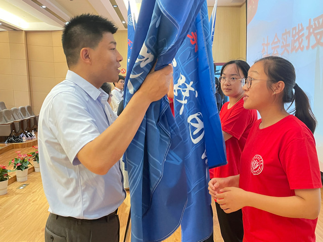 之后,与会领导向社会实践团队代表授旗。