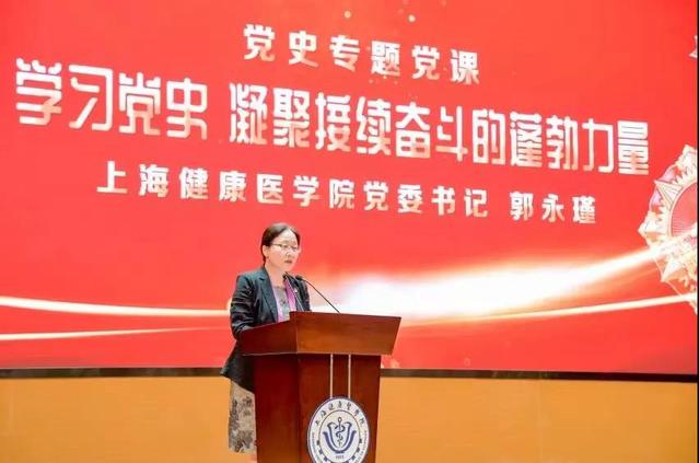 郭永瑾以“学习党史,凝聚接续奋斗的蓬勃力量”为主题,从三个方面给大家上了一堂党史专题党课。第一,学党史,时刻牢记党的初心和使命。带领大家重温了习近平总书记关于开展党史学习教育的重大意义,从中国特色卫生健康事业发展道路的视角和大家一起回顾党的光辉历史,阐释中国共产党始终坚持人民至上、生命至上,坚持以人民为中心的发展理念。第二,学习党史,切实推动工作高质量发展。结合学校办学实际开展党史学习教育,坚持立德树人,为党育人、为国育才,通过开展大调研、大讨论、各类专题座谈等,确定重点发展项目和“我为群众办实事”清单,切实想群众所想、急群众所急,扎扎实实为学校谋发展、为群众办实事。第三、学习党史,为建设高水平大学接续奋斗。在建党百年、党史学习教育、“十四五”规划启动年等大背景下,以及学校即将召开第一次党代会、“十四五”规划全面启动、高水平地方高校建设培育立项等小背景下,郭书记鼓励全校党员要坚定理想信念、传承红色基因、弘扬担当精神,努力建设具有鲜明特色、国内一流、国际知名的应用型医学院校,为守护人民健康提供强有力的人才保障,以优异成绩为建党一百周年献礼!